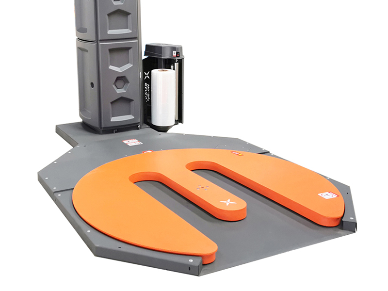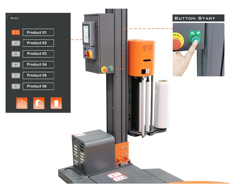 Применение машины для упаковки поддонов- После установки груза на стол, оператор закрепляет пленку на столе и запускает упаковочный цикл нажатием кнопки на панели управления.