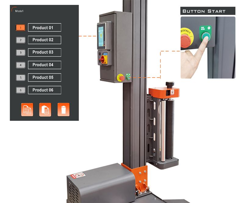 Применение машины для упаковки поддонов- После установки груза на стол, оператор закрепляет пленку на столе и запускает упаковочный цикл нажатием кнопки на панели управления.
